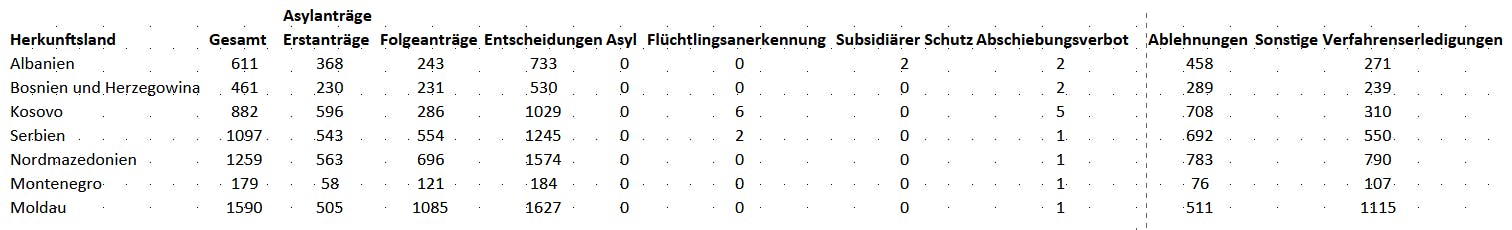 Die Asylzahlen des BAMF für das Jahr 2025 liegen vor. Ich habe die Zahlen für die Staaten, die im Zusammenhang mit Roma* am relevantesten sind („Westbalkan 6“ plus Moldau) in einer Tabelle zusammengefasst.